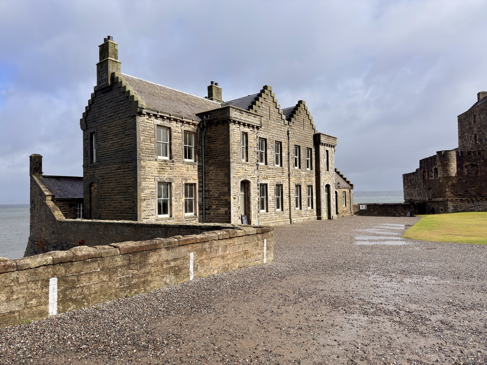 Da es am Vormittag noch recht ruhig zugeht, beschließen wir, spontan einen kurzen Abstecher zum Blackness Castle zu machen. Die alte Festung liegt nur wenige Minuten von unserer Unterkunft entfernt – also ideal für einen kleinen Ausflug, bevor der Sturm richtig loslegt. Schon bei der Anfahrt merken wir, dass der Wind zunimmt. Die Böen werden kräftiger, der Himmel dunkler, und die Wellen am Firth of Forth schlagen höher gegen die Mauern des Schlosses. Noch ist alles im Rahmen, doch man spürt: Das ist nur die Ruhe vor dem eigentlichen Sturm. Der Peak soll erst am Nachmittag kommen.